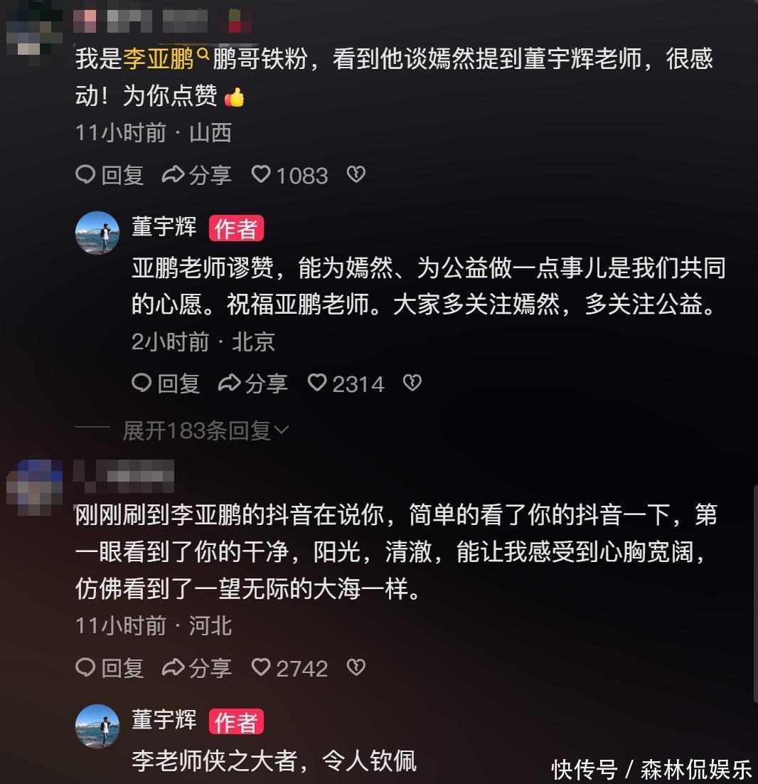 2月8日,有网友在董宇辉账号下评论。董宇辉回复称:“李老师侠之大者,令人钦佩。”董宇辉还表示:“能为嫣然、为公益做一点事儿是我们共同的心愿,祝福亚鹏老师。大家多关注嫣然,多关注公益。”